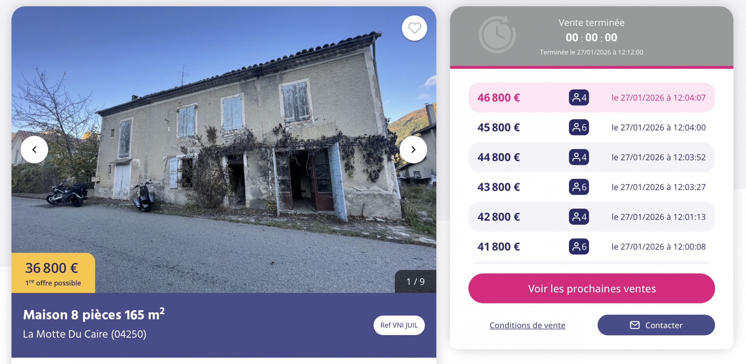 Première offre 99 000€ / Dernière offre 165 000€